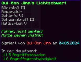 Qui-Gon Jinn's Lichtschwert ist eine mächtige Waffe mit Rückstoß III, Reparatur, Schärfe VI und Schwungkraft III. Es ist extrem haltbar (Haltbarkeit V) und perfekt für alle Jedi-Meister. "Fühlen, nicht denken! Nutze deinen Instinkt," sagt Qui-Gon Jinn selbst. Dieses Schwert verleiht dir 11.5 Angriffsschaden und 1.6 Angriffsgeschwindigkeit.