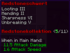 Ein glühendes Schwert, geboren aus dem Herzen der Redstone-Minen. Es verspricht reichliche Belohnungen für jeden Sieg (Plünderung), repariert sich selbst während der Kämpfe (Reparatur), schneidet durch Widerstand wie durch Butter (Schärfe) und ist unerschütterlich in seiner Haltbarkeit (Haltbarkeit). Ein Juwel für tapfere Kämpfer, die im Glanz des Redstones leuchten möchten.
