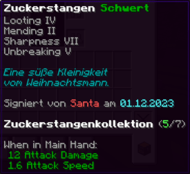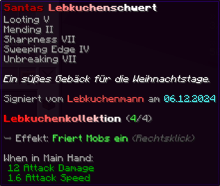 Ein festliches Schwert, das so süß und unwiderstehlich ist wie ein Zuckerstangen-Leckerbissen. Es beschenkt seinen Träger mit einem Überfluss an Beute (Plünderung), heilt sich selbst, als wäre es mit magischer Festtagsstimmung gewoben (Reparatur), ist schärfer als der kälteste Wintereiswind (Schärfe) und hält länger als die längste Weihnachtsnacht (Haltbarkeit). Ein Schwert, das Freude in jedem Kampf bringt.