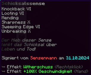 Eine mächtige Sense des Todes, die das Schicksal über Leben und Tod lenkt. Sie ist verzaubert mit Rückstoß VI, Plünderung VI, Reparatur, Schärfe X, Schwungkraft VI und Haltbarkeit X.