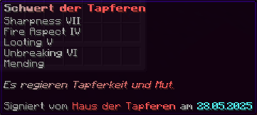 Dieses ehrwürdige Schwert wurde einst von den ersten Verteidigern des Lichts geführt. Es ist ein Vermächtnis des Hauses der Tapferen, geschmiedet in den lodernden Flammen des Mutes. Die Verzauberungen Schärfe VII, Verbrennung IV, Plünderung V, Unbreaking VI und Reparatur II machen es zu einer Waffe, die nicht nur durch ihre Klinge, sondern auch durch ihre Geschichte triumphiert. In den Händen eines wahren Helden regiert es mit Entschlossenheit – dort, wo Feigheit keinen Platz hat.