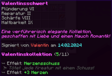 Dieses Schwert ist eine Liebeserklärung in Stahl, geschmiedet mit "Plünderung VI" für reiche Beute, "Reparatur II" für Selbstheilung und "Schärfe VIII" für unvergleichliche Kraft. Als Herzstück der Valentinskollektion, verfügt es über den einzigartigen Effekt "Herzensschuss", der jede Kreatur mit einem Schlag trifft.