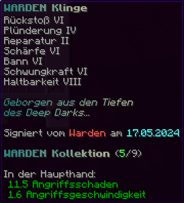 Die WARDEN Klinge ist eine mächtige Waffe. Mit Rückstoß VI und Plünderung IV stößt sie Feinde zurück und sorgt für wertvolle Beute. Reparatur II, Schärfe VI, Bann VI und Schwungkraft VI machen sie extrem stark und langlebig (Haltbarkeit VIII). Geborgen aus den Tiefen des Deep Darks und signiert vom Warden selbst, verleiht sie dir 11.5 Angriffsschaden und 1.6 Angriffsgeschwindigkeit.