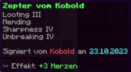 Ein Artefakt von unermesslicher Macht, durchdrungen mit der Kraft der Täuschung und des Chaos. Mit Rückstoß IV, Plünderung IV, Reparatur, Schärfe VII und Haltbarkeit IV verzaubert, entfesselt dieses Zepter unaufhaltsame Macht.