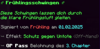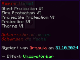 Beherrsche mit diesen Schwingen die Macht! Die Vampirflügel sind verzaubert mit Explosionsschutz VI, Feuerschutz VI, Schusssicher VI, Schutz VI und Dornen VI, um ihren Träger unaufhaltsam zu machen.