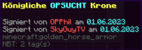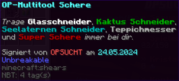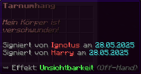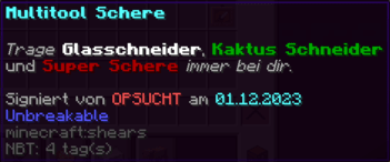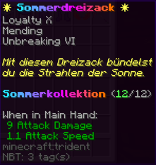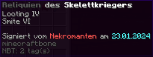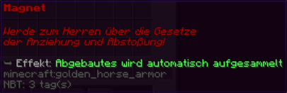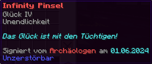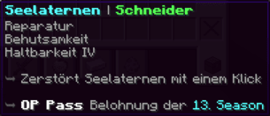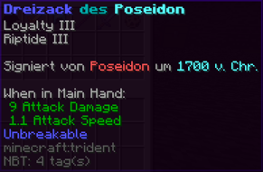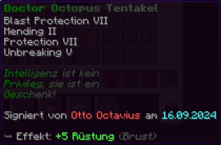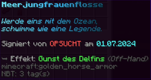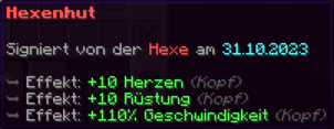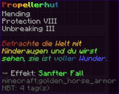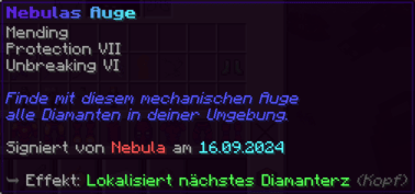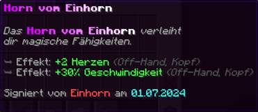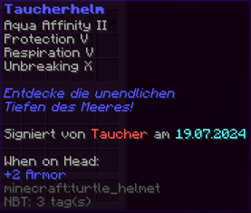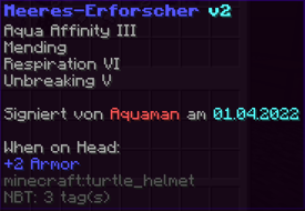 Mit diesem nahezu unzerstörbaren Helm (Haltbarkeit X) kannst du die unendlichen Weiten des Meeres erkunden, ohne jemals um Atem ringen zu müssen (Atmung V). Tauche tiefer als je zuvor, erkunde geheimnisvolle Unterwasserwelten und entdecke Schätze, die noch nie ein Abenteurer zuvor gesehen hat. Seine magische Kraft schützt dich vor allen Gefahren der Tiefsee (Schutz V) und gibt dir die Freiheit, wie ein Fisch durch das Wasser zu gleiten (Wasseraffinität II).