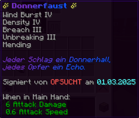 Die Donnerfaust lässt jeden deiner Schläge wie ein Donnergrollen durch die Luft hallen. Mit Windstoß IV, Dichte IV, Durchbruch III, Haltbarkeit III und Reparatur ist sie ein Symbol für rohe Macht und unaufhaltsame Zerstörung. Ein Hieb genügt, um selbst den stärksten Gegner erzittern zu lassen.