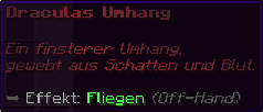 Ein finsterer Umhang, gewoben aus Schatten und Blut. Er trägt den Fluch des Nachtherrschers in seinen Falten und verleiht seinem Träger die Freiheit der Lüfte. Nur jene, die das Dunkel umarmen, können seine Macht entfesseln.
