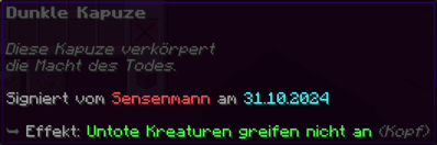 Diese Kapuze verkörpert die Macht des Todes und schützt ihren Träger vor den Angriffen der Untoten. Ein Symbol der dunklen Macht, signiert vom Sensemann persönlich.