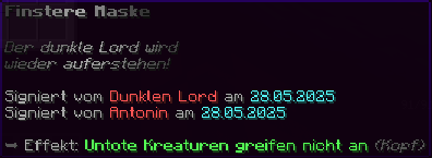 Ein Symbol des Flüsterns, der Schwüre, der Wiederkehr. Die finstere Maske ist durchtränkt von dunkler Magie. Sie schützt nicht durch Stärke – sondern durch Zugehörigkeit. Wer sie trägt, wird von den Toten erkannt… und verschont.