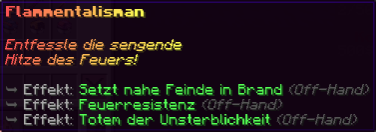 Ein Talisman, der die sengende Hitze des Feuers entfesselt. Er macht seinen Träger widerstandsfähig gegen Flammen und verleiht ihm die Macht, Gegner in Brand zu setzen.