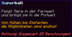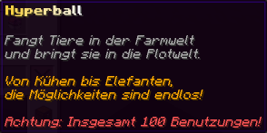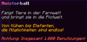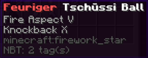 Der Feurige Tschüssi Ball ist voller magischer Kraft. Mit Feueraspekt V entzündet er jeden Gegner sofort in Flammen, sobald er ihn berührt. Doch das ist nicht alles! Dank Rückstoß X schleudert er deine Feinde so weit weg, dass sie in Windeseile verschwinden – "Tschüssi!"