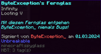 ByteException's Fernglas ist ein magisches Instrument, das dir hilft, selbst die kleinsten Details aus der Ferne zu erkennen. Mit der unendlichen Sichtweite (Infinity) und der besonderen Fähigkeit, dir wertvolle Entdeckungen (Plünderung V) zu offenbaren, wirst du niemals einen wichtigen Moment verpassen.