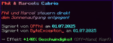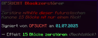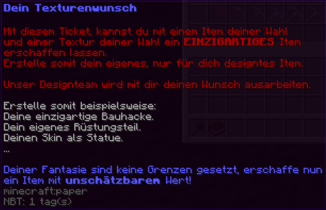 Dein Texturenwunsch ist ein magisches Ticket, das dir die Möglichkeit gibt, ein einzigartiges und nur für dich designtes Item zu erschaffen! Mit diesem besonderen Ticket kannst du deine Fantasie zum Leben erwecken – ob eine individuelle Spitzhacke, eine besondere Rüstung oder sogar eine Statue deines eigenen Skins. Das Designteam arbeitet mit dir zusammen, um deinen Traum wahr werden zu lassen. Es gibt keine Grenzen, nur unendliche Möglichkeiten!