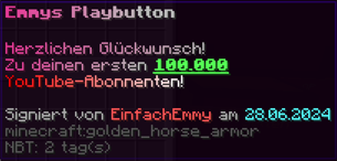 Dieser funkelnde Schatz wurde EinfachEmmy für ihre 100.000 YouTube-Abonnenten verliehen und trägt die magische Signatur von EinfachEmmy vom 28.06.2024.