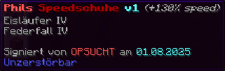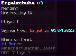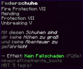 Die Federschuhe sind wie gemacht für die mutigsten Abenteurer. Mit ihrem unschlagbaren Feuerschutz VII trotzen sie sogar den heißesten Lavaflüssen, und dank Schutz II bist du vor jeder Gefahr geschützt. Die Reparatur-Verzauberung sorgt dafür, dass sie sich von allein reparieren, und Haltbarkeit V macht sie fast unzerstörbar.