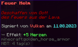 Der Feuer Helm wurde vom mächtigen Gott des Feuers persönlich aus flüssiger Lava geschmiedet und verleiht dir unglaubliche Stärke. Signiert von Vulkan am 11.08.2023, steckt in ihm die glühende Kraft der Vulkane.