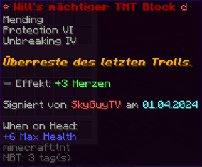Mit Will's mächtigem TNT Block trägst du die Überreste des letzten großen Trolls bei dir! Dieses explosive Artefakt schützt dich nicht nur mit unglaublicher Stärke (Schutz VI), sondern schenkt dir auch zusätzliche Herzen für noch mehr Durchhaltevermögen, während er nahezu unzerstörbar ist (Haltbarkeiteit IV) und sich immer wieder aufpäppeln lässt (Reparatur)