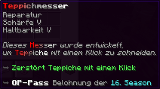 Das Teppichmesser wurde entwickelt, um Teppiche mit einem Klick zu schneiden. Mit Reparatur bleibt es in Topform, und Schärfe V macht es extrem scharf. Haltbarkeit V sorgt dafür, dass es lange hält. Dieses Messer zerstört Teppiche mit einem Klick und ist eine Belohnung der 16. Season im OP-Pass.