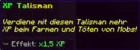 Der XP Talisman ist ein essenzielles Artefakt für jeden Abenteurer. Mit diesem Talisman in deinem Besitz verdienst du beim Farmen und Töten von Mobs mehr Erfahrungspunkte. Der Effekt multipliziert deine XP-Ausbeute um das 1,5-fache, sodass du schneller leveln kannst. Ein Muss für alle, die effizienter und erfolgreicher durch die Lande streifen wollen.